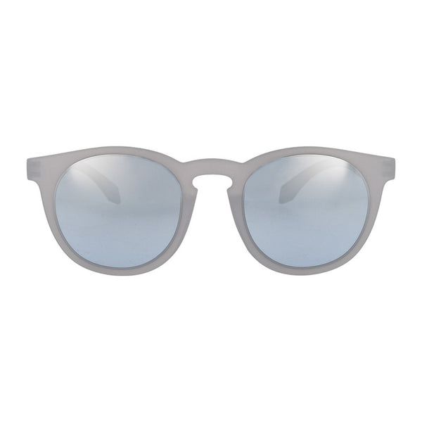 Occhiali da sole unisex alla moda con montatura grigio chiaro trasparente e lenti blu con rivestimento a specchio argentato.